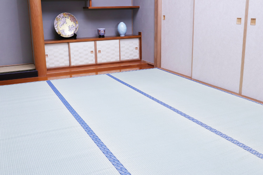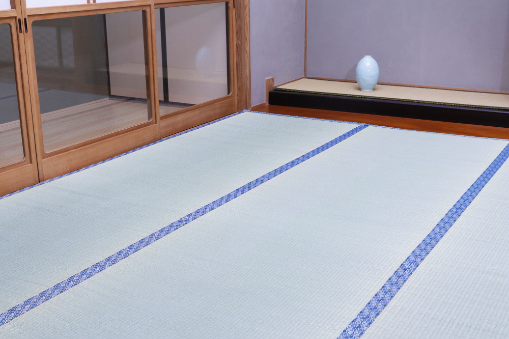 ■い草を使用しています。い草は一本一本が太く、表皮が厚く繊維がキメ細かいので弾力性があり、耐久性に優れています。い草には空気の清浄化作用、湿度の調節作用があり、汚れにくいといった特徴があります。