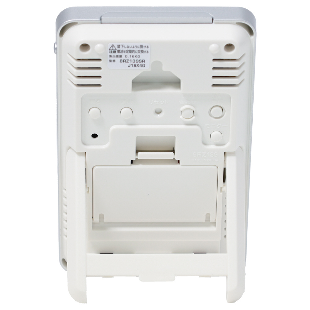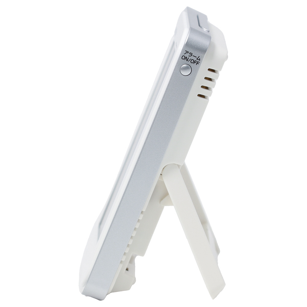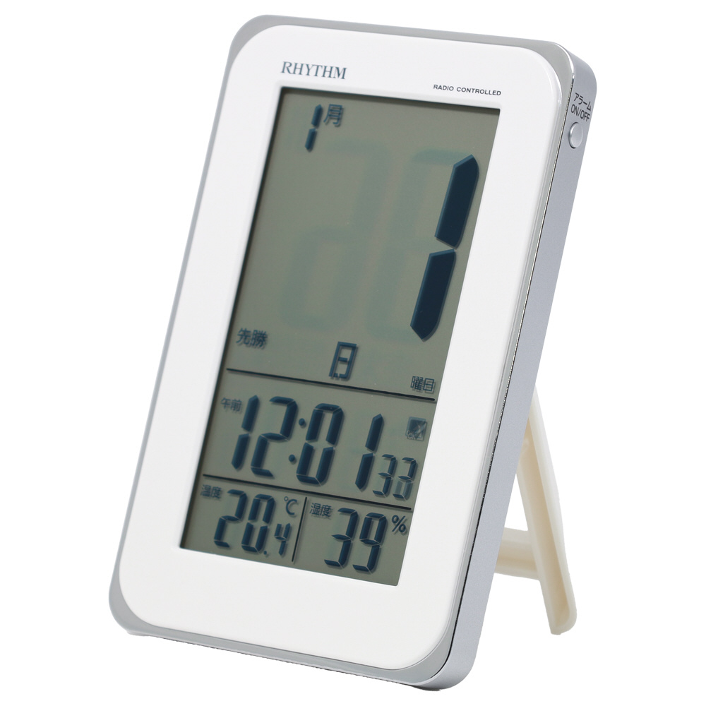 カレンダー表示の大きなデジタル電波目覚まし時計。コンパクトなサイズ感で掛け置き兼用なので場所を選びません。