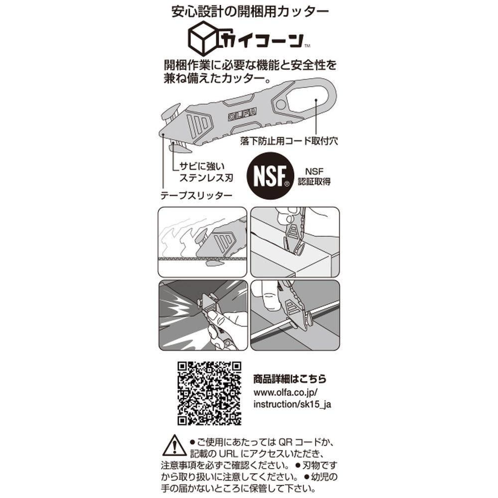 刃に指が触れにくい安心設計の開梱用カッター。荷物の開梱や一般PPバンド、ストレッチフィルム、薄いダンボールなどの切断に。作業性・安全性も考慮し、替刃交換不要な使い切りタイプ。水洗い可能で、衛生面にも配慮。NSF規格認証取得。\n10コ入の業務用パッケージ。