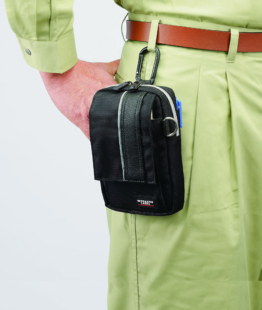 5〜5.5インチのスマホも入る小物ケース。仕事やプライベートでも使える。5.5インチクラスのスマホ・携帯電話・タバコ等に対応したゆったりポケット仕様。ねじれ防止型カラビナ使用。2way装着対応:ベルト・カラビナから装着できる。反射ライン付き、撥水加工。後部は摩擦に強いナイロン製。