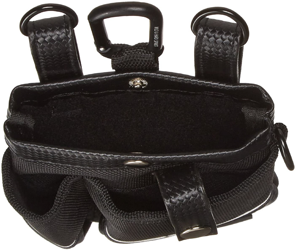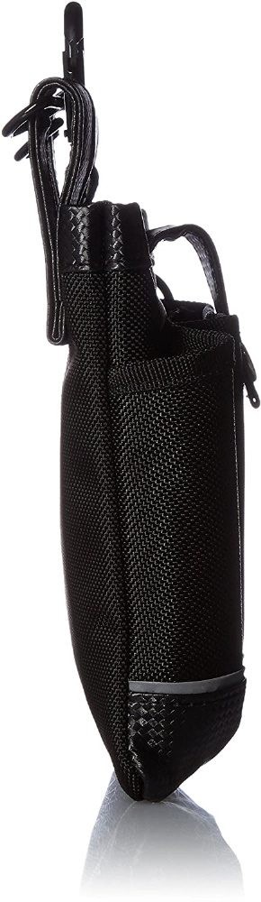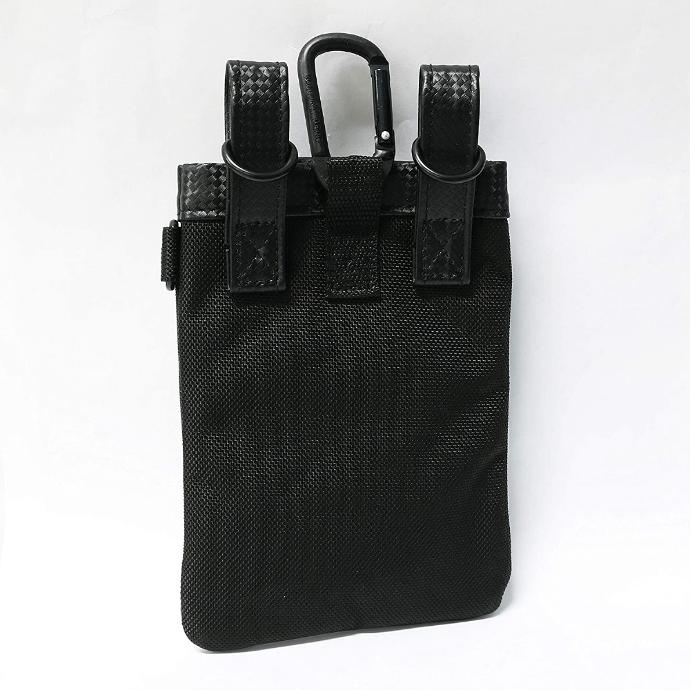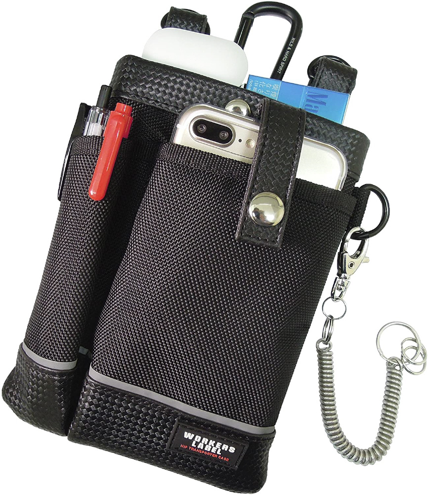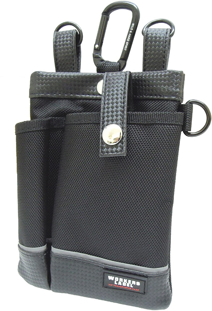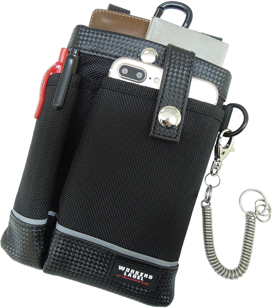 大きめのスマホも入る小物ケース。夜間や暗所での作業を考え、反射ラインを取り付けてあります。野外活動に適した「撥水加工」を施していますので、雨粒程度の水滴を弾きます。ねじれにくい カラビナ付。装着方法は2WAY カラビナ装着・ベルト装着。
