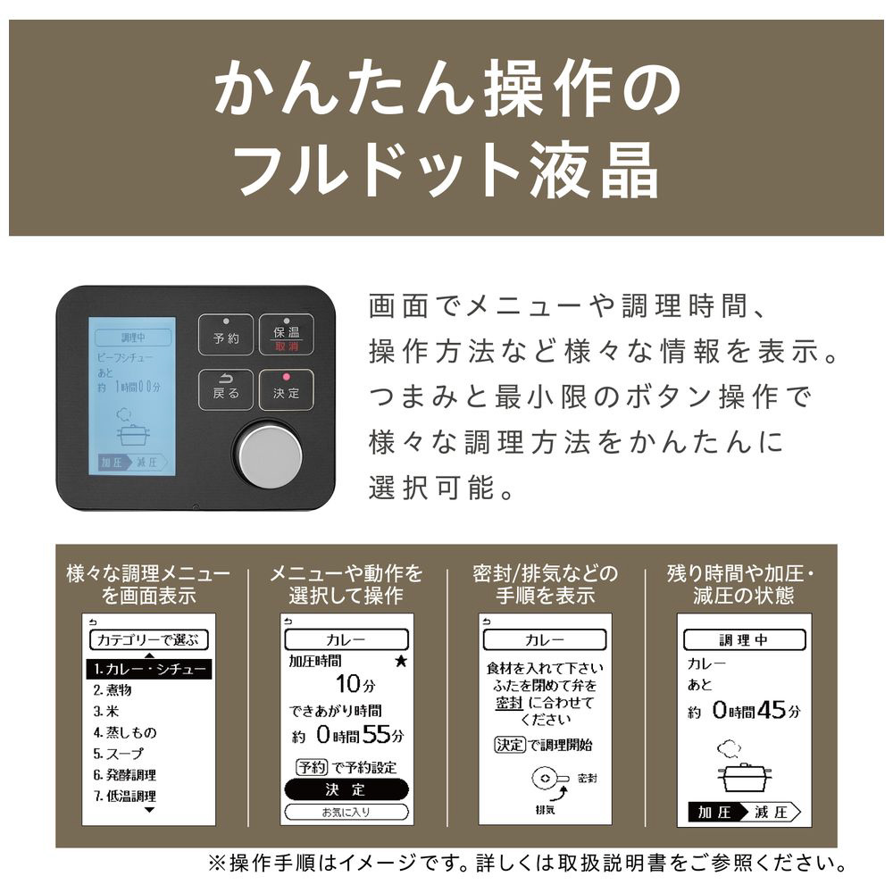 毎日の食卓で家族の夕食や、友人があつまってホームパーティーなど、圧力調理だけでなく、お鍋などの卓上調理も楽しめる。卓上で取り分けやすい高さに設計。