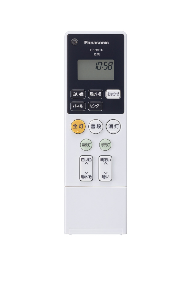 リモコン【パネル(2・1枚切替可能)・センター・おまかせ・全灯・普段・白い色・暖かい色・常夜灯〈6段調光可能〉・滅】 リモコン送信器使用時のみ〈100%〜約5%〉調光・〈昼光色〜電球色〉調色可能・常夜灯(6段調光可能)↓↓壁スイッチ【普段→常夜灯】おやすみタイマー るすばんタイマー