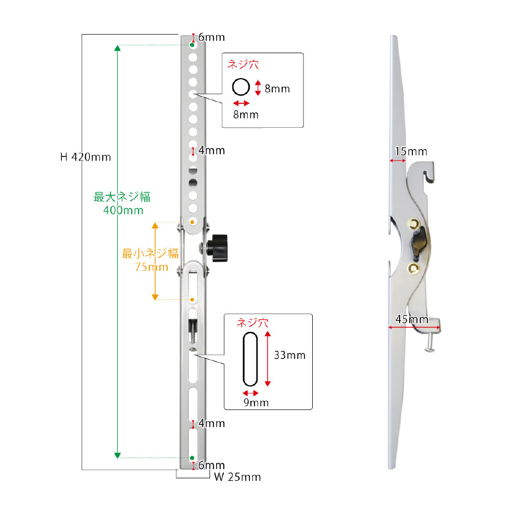 ・モニター背面のネジ穴の間隔が「縦:75〜400mm 横:75〜400mm」の範囲内である事
