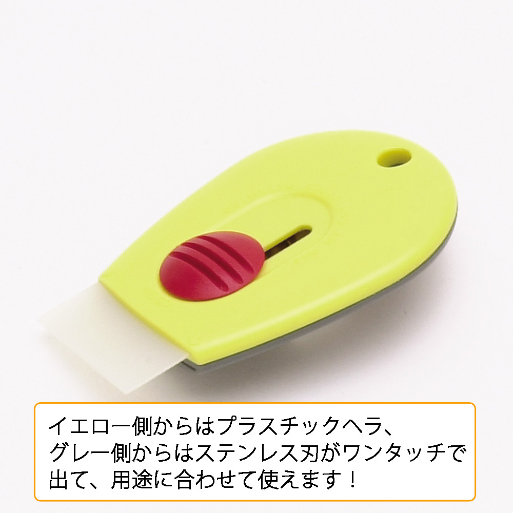 ●ステンレス刃(グレー側)とプラスチックヘラ(イエロー側)がついた携帯に便利なミニスクレーパー。
