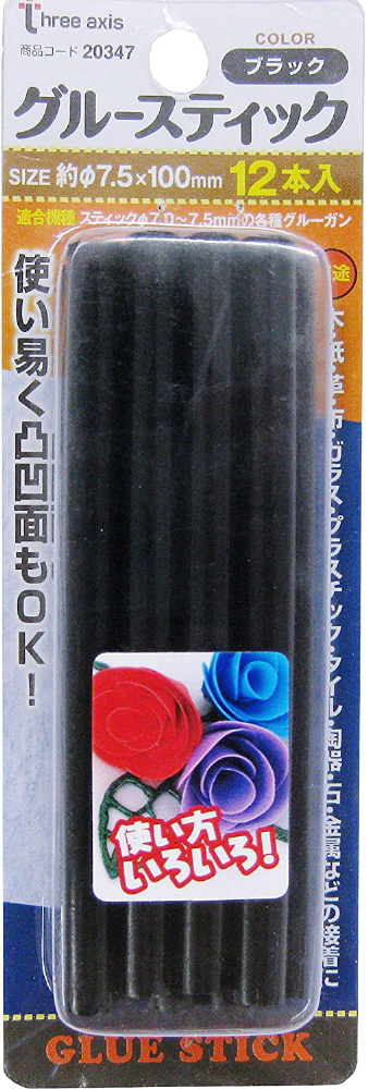 適合可能機種:スティック7.0〜7.5mmの各種グルーガン。家庭用品品質表示法による表示:種類/熱溶融形接着剤 成分/エチレン、酢酸ビニル45.9%、合成樹脂44%、パラフィン10%、顔料0.1% 用途/木、紙、革、布、ガラス、プラスチック、タイル、陶器、石、金属 質量/48g。