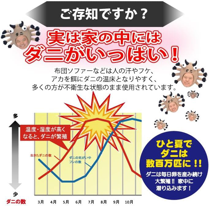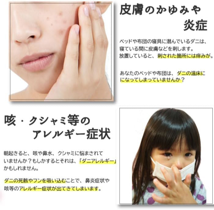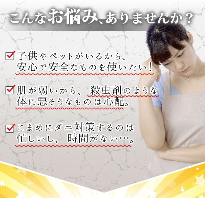 ダニクリンは、殺虫剤のように殺虫成分でダニを直接殺す成分ではありません。ダニをよせつけにくい効果でダニを減らしていく商品です。今お使いの布団やカーペットにスプレー加工するだけの手軽さです。