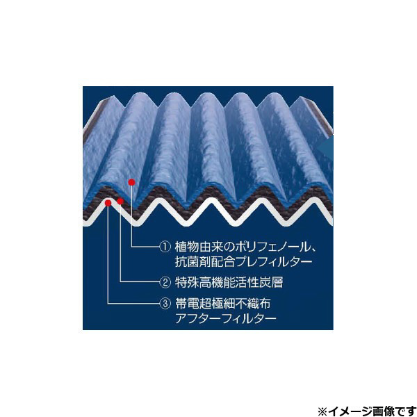 フィルター2層目の活性炭層が排ガス臭、ペット臭、タバコ臭、カビ臭など多くの臭気成分を効果的に吸着。