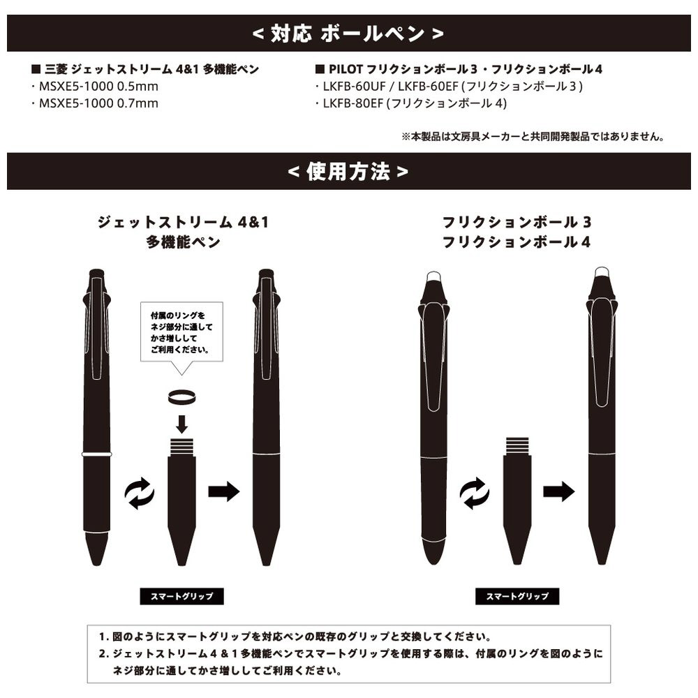 市販の多機能・多色ボールペンのグリップ部分をSMART-GRIPに付け替えることでよりペン先が見やすく、文字が書き易く、グリップのホールド感を向上させます。