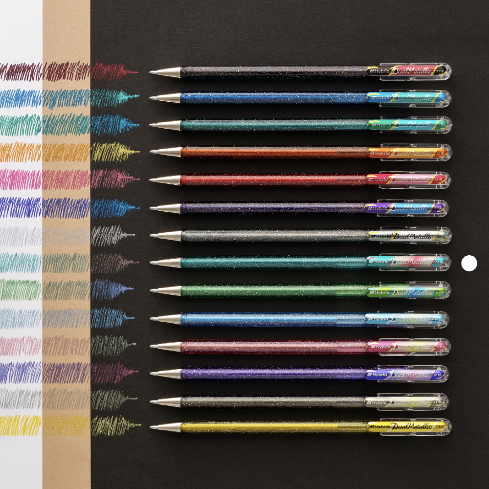 白い紙では鮮やかに、黒などの濃く深い色の紙ではグリッターの輝きがきわだち幻想的に、1本で多彩な表現をお楽しみいただけます。
