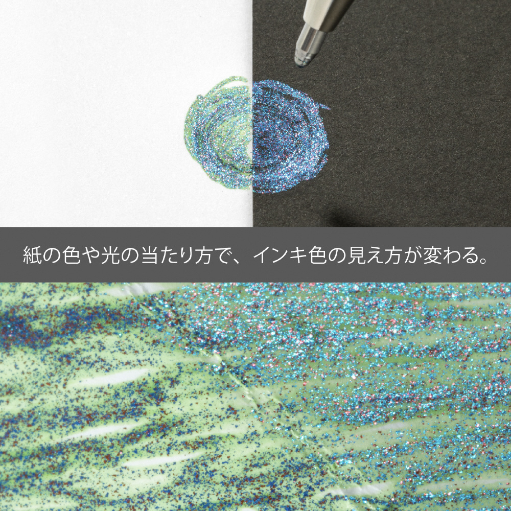 ひとつの線にふたつの輝きを宿す、遊び心あふれるボールペンです。 インクとグリッターの色が異なるため、光の角度や背景の色によって変化して見える色彩を生み出します。