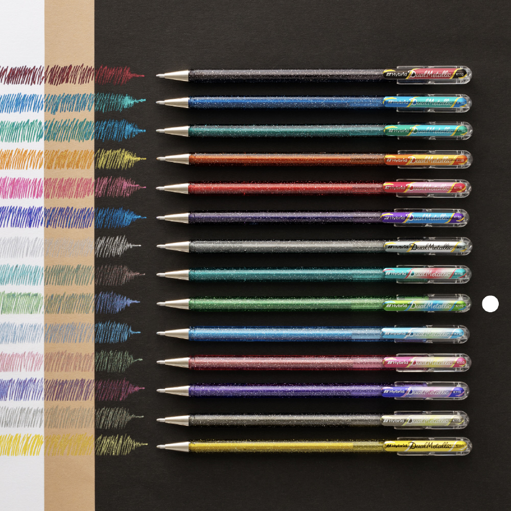 白い紙では鮮やかに、黒などの濃く深い色の紙ではグリッターの輝きがきわだち幻想的に、1本で多彩な表現をお楽しみいただけます。