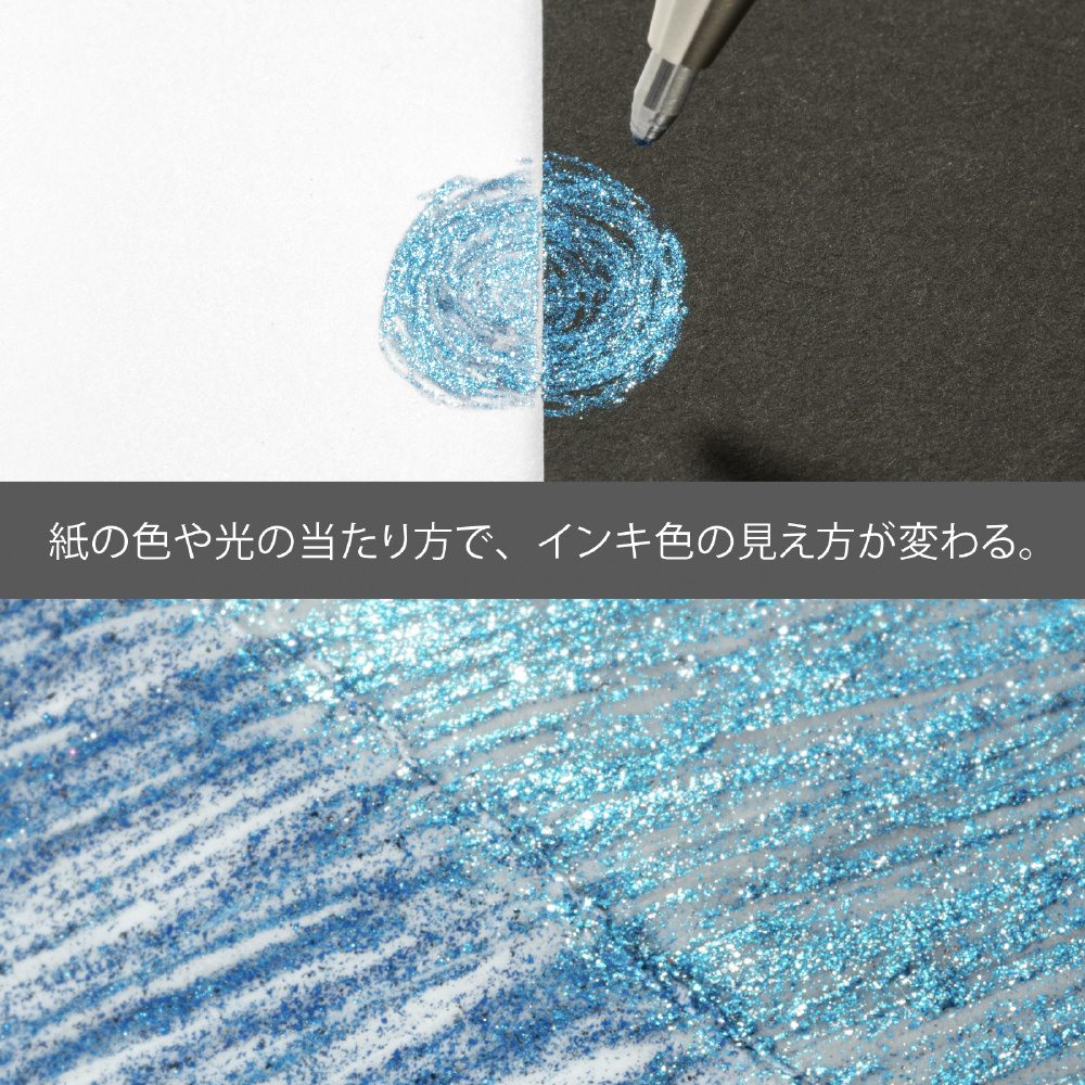 ひとつの線にふたつの輝きを宿す、遊び心あふれるボールペンです。 インクとグリッターの色が異なるため、光の角度や背景の色によって変化して見える色彩を生み出します。
