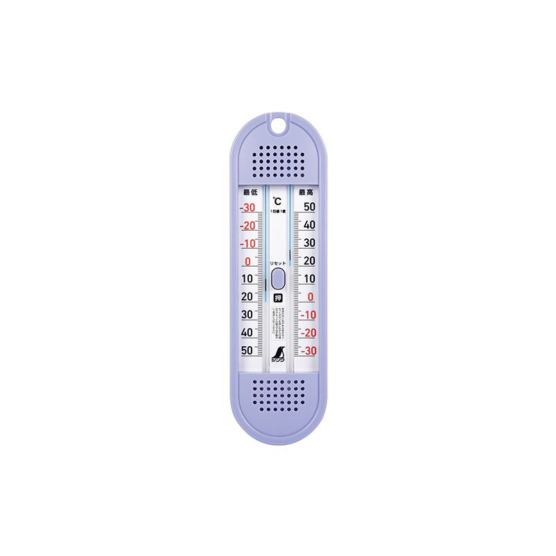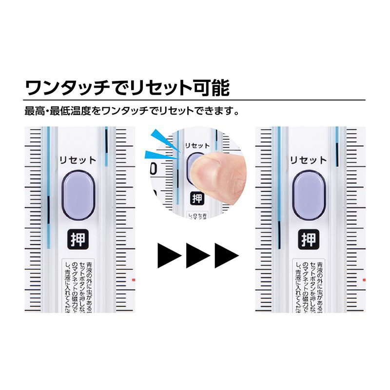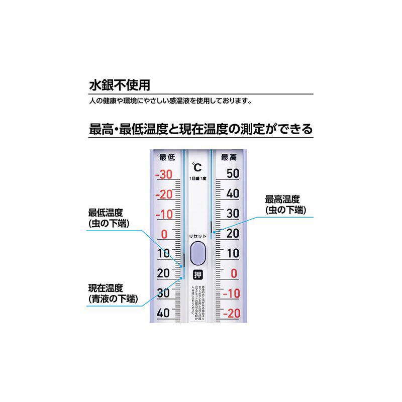 最高・最低温度と現在温度が1台で測定可能。お好きな期間の最高・最低温度を計測できます。水銀不使用。電池不要でワンタッチ式の温度計。水に強い。寒冷地でも-30度まで検束可能。