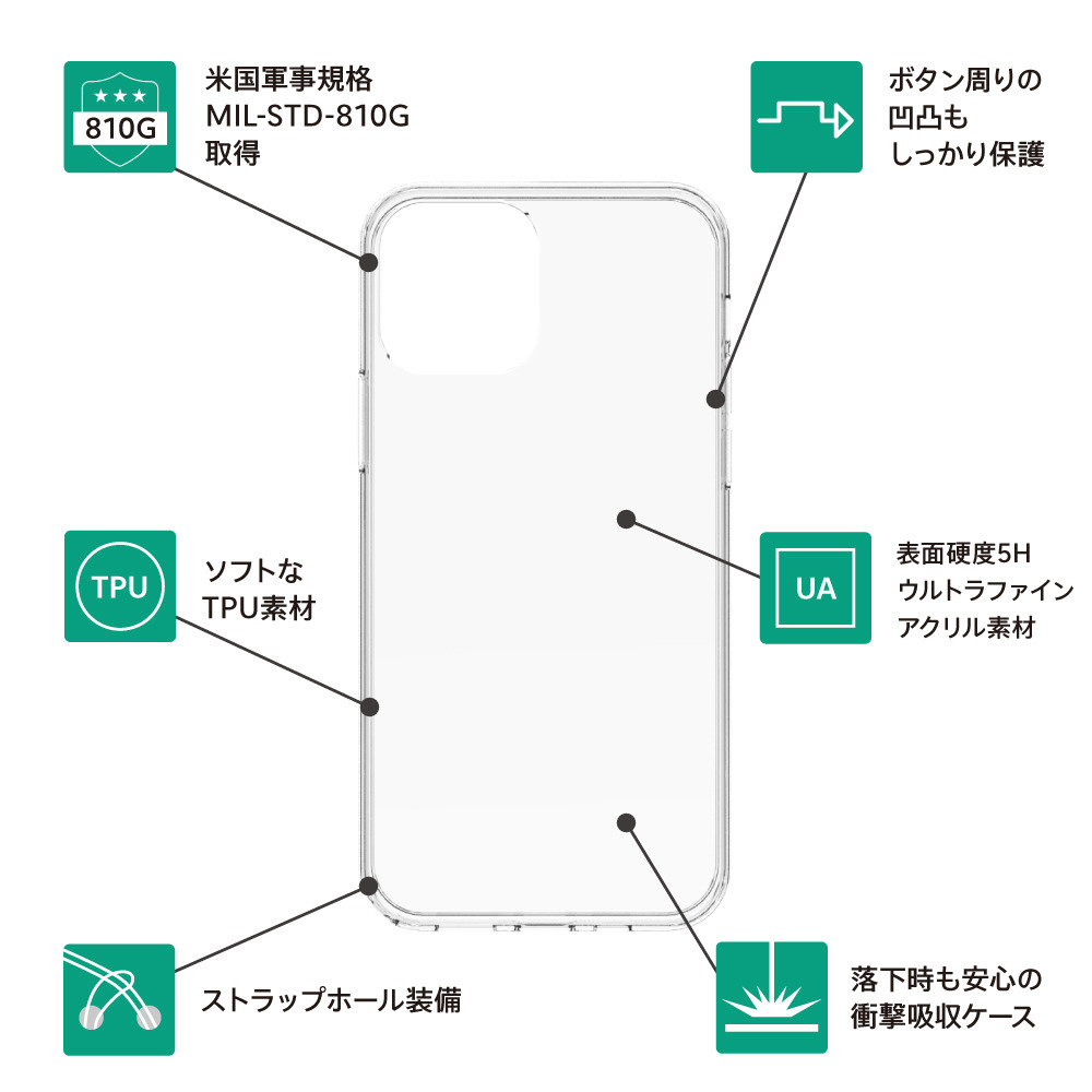 ・しなやかな素材で衝撃を吸収・落下時も安心の衝撃吸収ケース・表面硬度5H、傷に強い特殊樹脂を採用・ストラップホール装備・落下・振動試験の米軍規格MIL-STD-810G取得・ケースに入れたままカメラ撮影が可能・ケースに入れたまま各種ボタンの操作が可能・純正MagSafe充電器対応。吸着力に影響がある時は適時ケースを取り外してください。