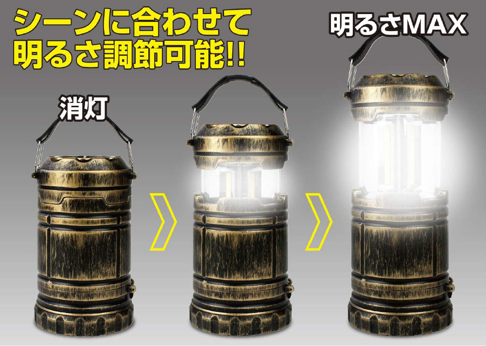 置く、吊るす、懐中電灯として、3パターンの使い方ができる自由自在のLEDランタン。キャンプや夜釣りなどのアウトドア、防災非常用として、あらゆるフィールドで。高輝度COB型LEDを採用。上に引き上げると点灯、下に押し戻すと消灯の暗闇でも操作しやすいスライド式電源ON/OFF、電源スイッチでの点灯で持ち手を付け替えて懐中電灯としても使えます。