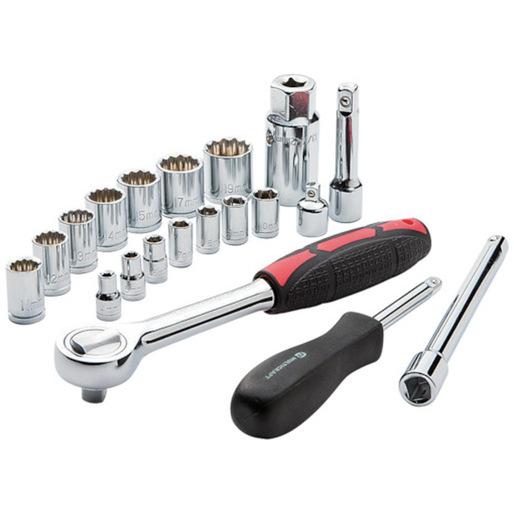 ・セット内容: 9.5mm角ラチェットハンドル、6.35mm角スピンナーハンドル、6.35mm角ソケット(4、5、6、7、8、9、10mm)、9.5mm角ソケット(11、12、13、14、15、17、19mm)、9.5mm角エクステンションバー(75mm、150mm)、ソケットアダプター凹9.5mm×凸6.35mm、9.5mm角スパークプラグソケット21mm