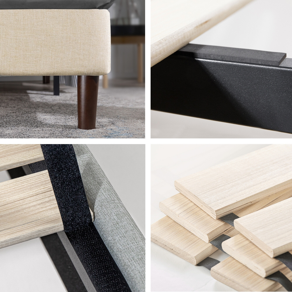 洗練された外観はZINUSのベッドの特徴の一つ。デザイン性にも機能性にも優れたスタイリッシュな布張りの脚付きベッドフレームです。