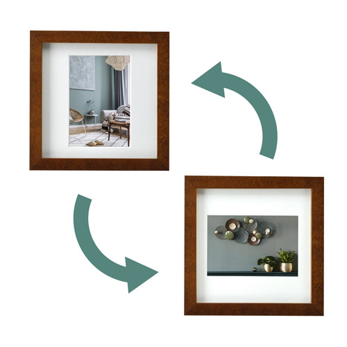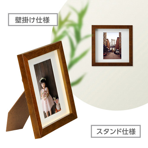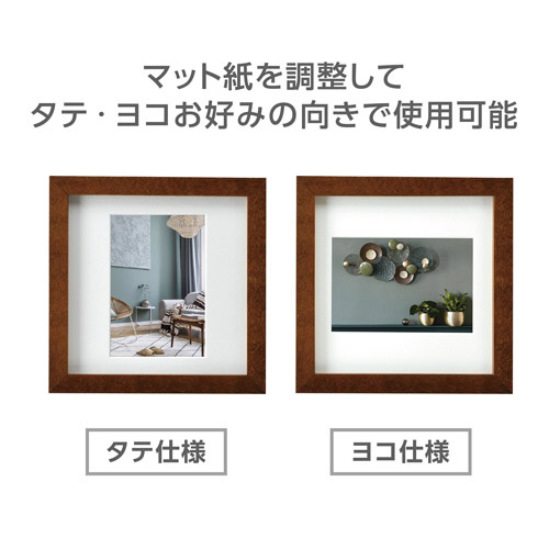 落ち着いたカラーリングと直線的でシンプルな額縁のデザインで、お部屋のコーディネートに合わせやすいスクウェア額縁。マット紙の向きを替えれば、タテ・ヨコどちらの向きの写真にも使用できます。