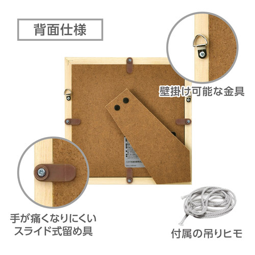 背板のスタンド、金具・付属の吊りヒモを使用して卓上にも壁にも飾ることが可能です。