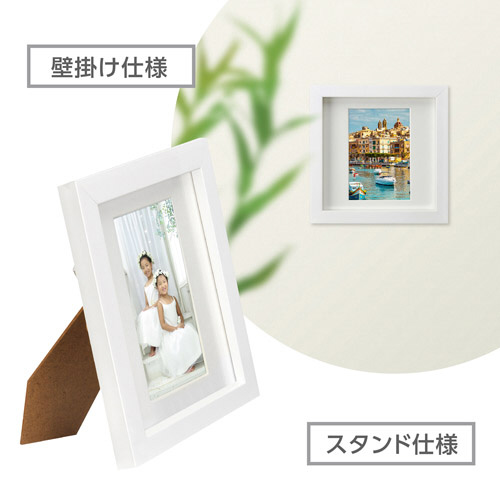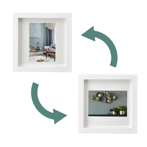 落ち着いたカラーリングと直線的でシンプルな額縁のデザインで、お部屋のコーディネートに合わせやすいスクウェア額縁。マット紙の向きを替えれば、タテ・ヨコどちらの向きの写真にも使用できます。