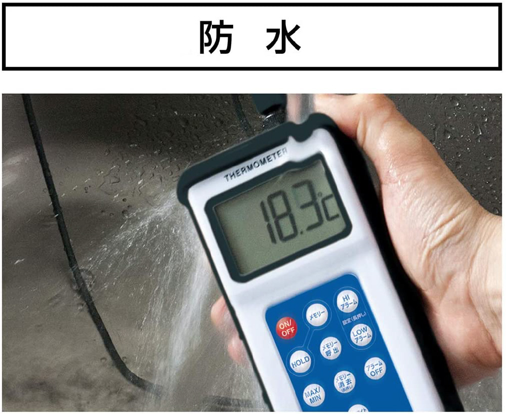 プローブ先端で温度を測定する中心温度計です。マイナス30度から250度まで測定できます。 IPX7の防水設計です。 用途に応じてプローブが交換可能です。 アスファルト施工時の温度測定に使用できます。