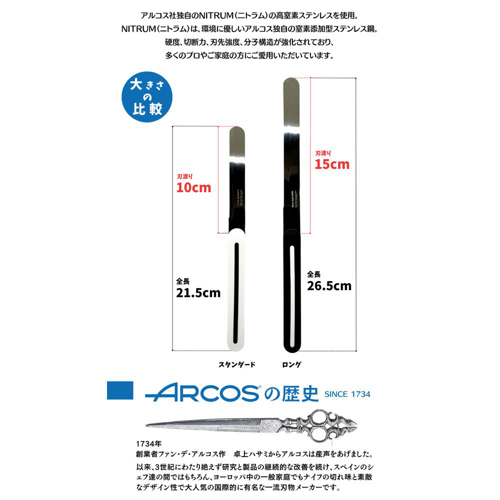 アルコス独自のステンレス鋼NITRUM(ニトラム)を使用し、薄くて丈夫なギザ刃でステーキ、トマト、フランスパンなども綺麗に気持ちよくカットします。超繊細なギザ刃がカット部分のつぶれを防ぎ、ツルっと滑らかな切り口は食材の美味しさを引き出します。刃先は丸くバターナイフにもなります。