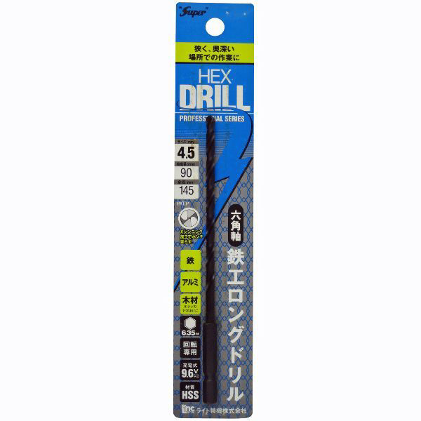 鉄・アルミ・木材の穴あけ作業に!狭く奥深い場所での作業に最適です。刃先は、ポンチ無しで、ブレずに正確な穴開けができるXシンニング加工が施されています。六角軸でインパクトドライバー(充電式9.6V以上)にワンタッチで取り付けることができます。サイズ:4.5mm 有効長:90mm 全長:145mm材質:HSS軸:六角軸6.35mm