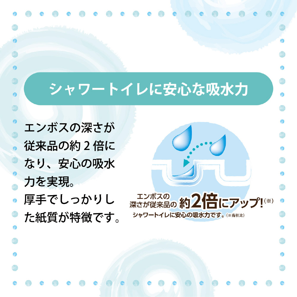・パルプ100%の柔軟性と厚みに加え、独自のエンボス加工により、吸水性が2倍(メーカー調べ)にアップ。シャワートイレに安心の吸水性を実現しました。