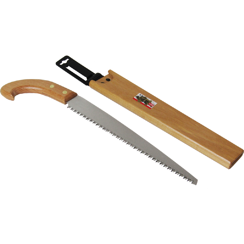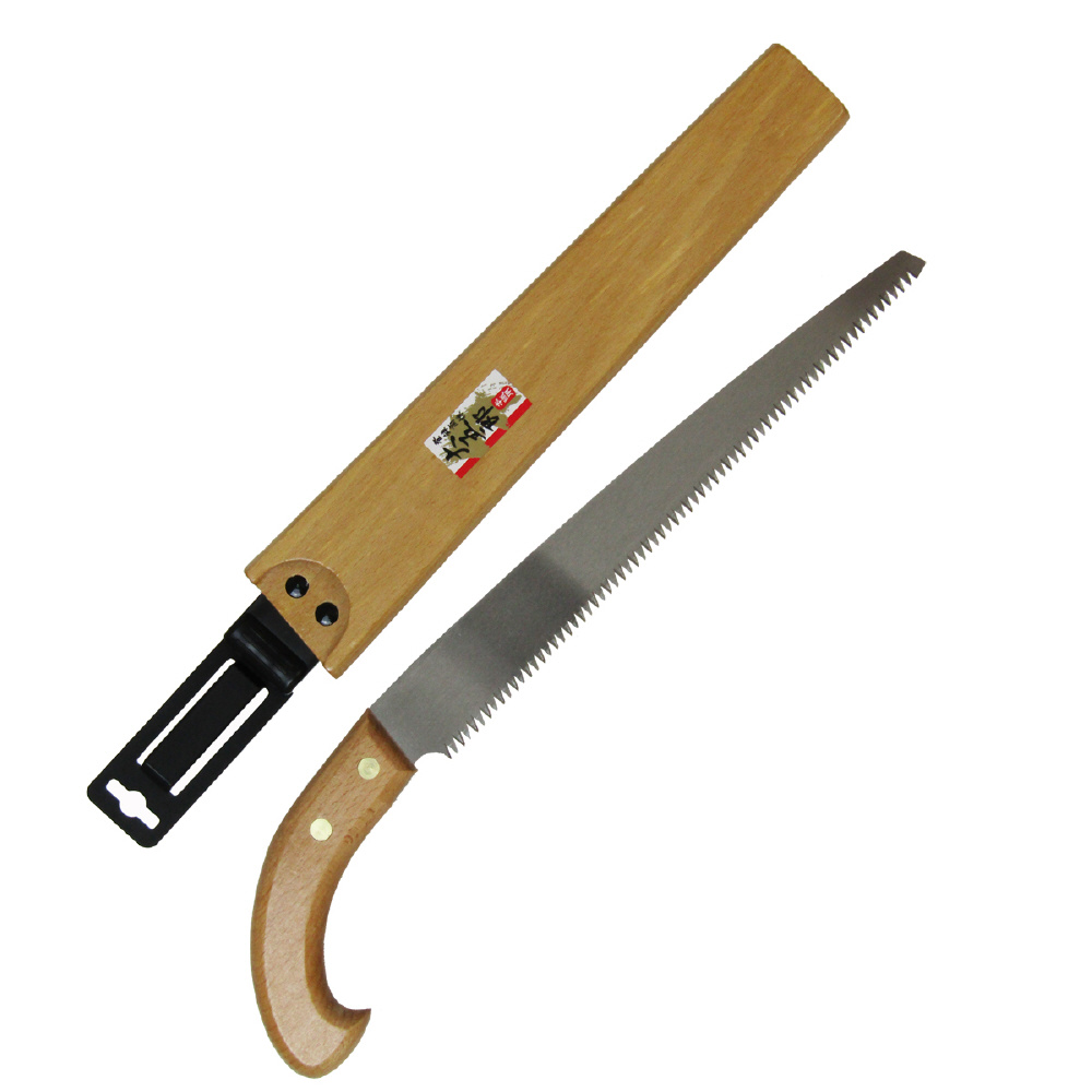 樹木、果樹の剪定に!。昔ながらの鞘入・木柄剪定鋸ですが、鋸刃は本職にも満足頂けますよう生木に最適な目立てを施してあります。腰に吊り下げできるサヤ付きなので携帯に便利です。