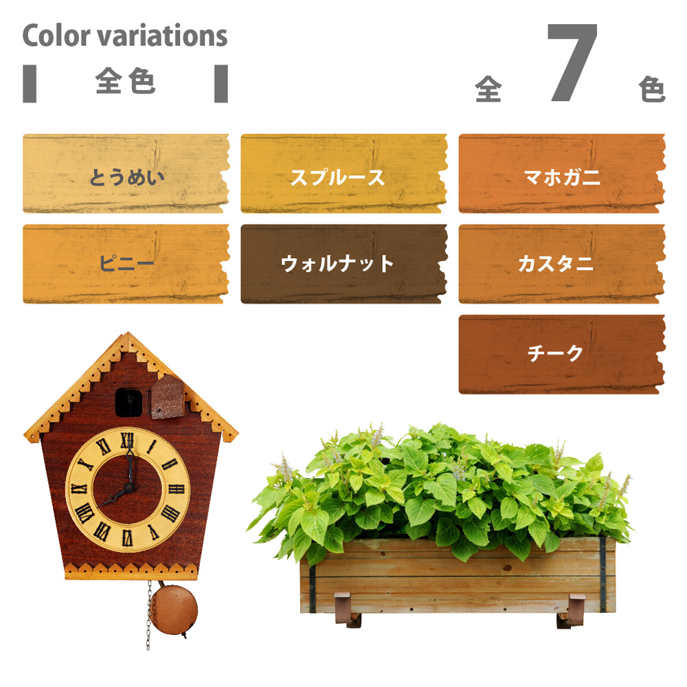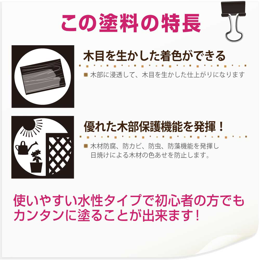 ●臭いが少なく、乾燥も速く、使いやすい水性タイプ。取り扱いが簡単だから女性や塗装初心者、ガーデングッズなどの塗装にピッタリです。※乾くと雨や水で流れ落ちる事はありません。【用途】屋外の木部(ウッドデッキ ラティス パーゴラ ベンチ ログハウス 羽目板 板へい)【塗れないもの】吸い込みのない木材(プリント合板・デコラ板)、常に水に浸かっている所、犬小屋・鳥小屋※塗装後も保護成分の臭いが若干残りますので、屋内木製品の塗装には不向きです。