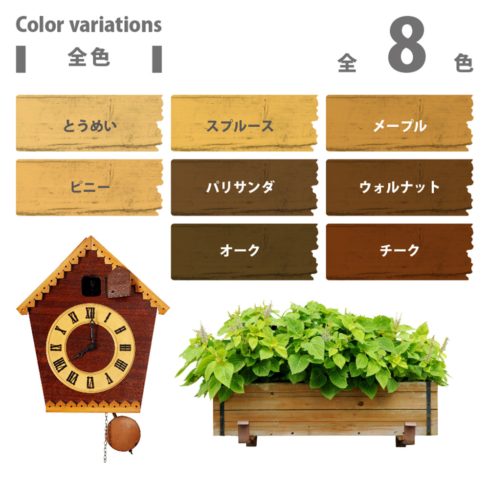 ●木目をいかしたまま表面に塗膜を作らず着色するので、木材の持つ自然な風合いを引き立たせます。