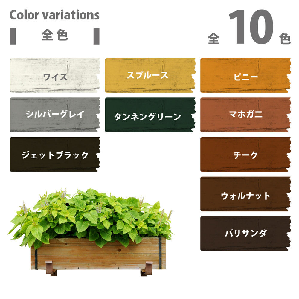 ●油性キシラデコールと同等の高い耐候性と保護性能を誇ります。 【用途】ラティス ・プランター・トレリス ・ガーデングッズ・ベンチ・フェンス ・遊具・ウッドデッキ ・パーゴラ・羽目板・窓枠・戸袋・板べい・ログハウスなど【塗れないもの】