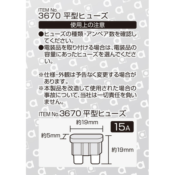 3670 平型ヒューズ 15A (約19×19×5mm)/5個入り 3670