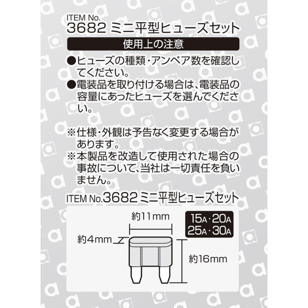 3682 ミニ平型ヒューズセット 15/20/25/30A (約11×16×4mm)/計5個入り 3682