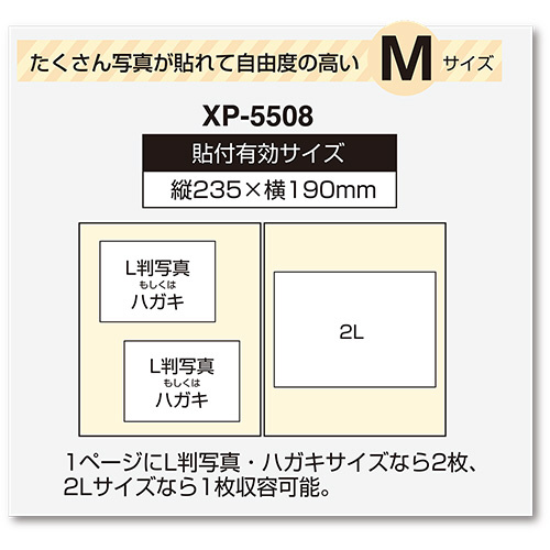 貼付有効サイズ:縦235×横190mm ※1ページにL判写真・ハガキサイズなら2枚、2Lサイズなら1枚収容できます。