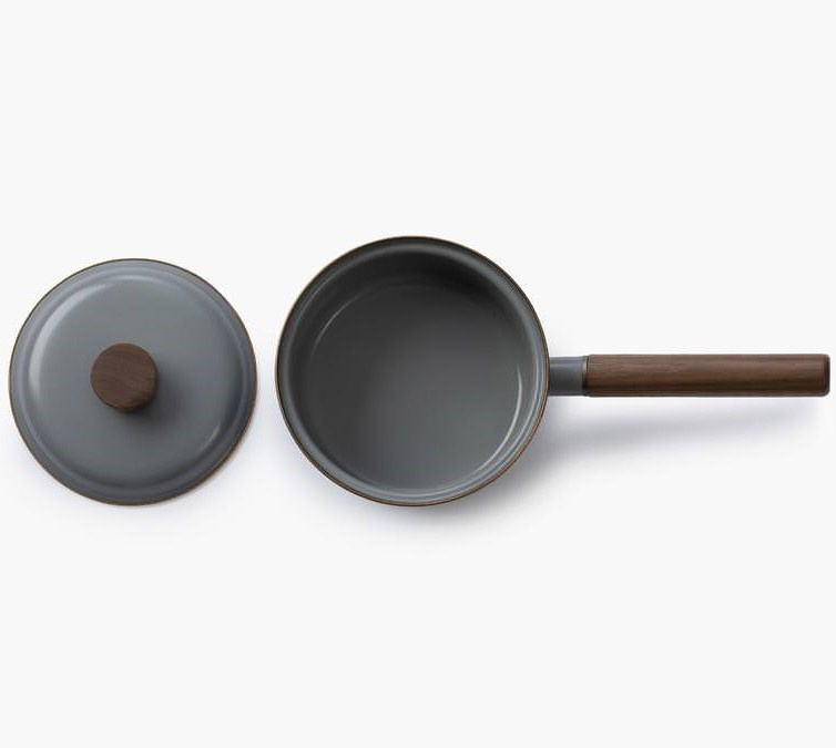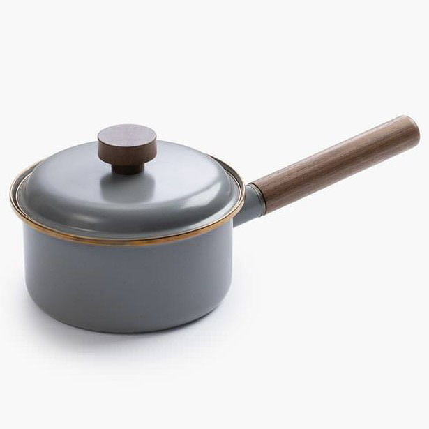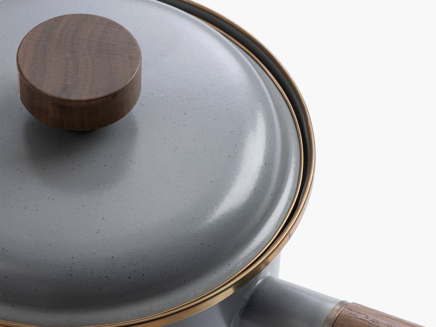 ストーングレーのエナメルと縁はステンレスリムで補強され、カラーはアンティークカッパー色で施され、