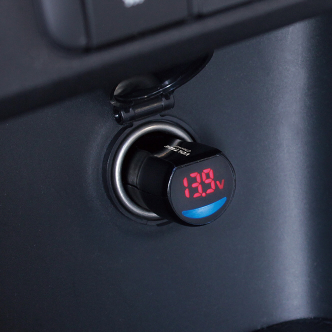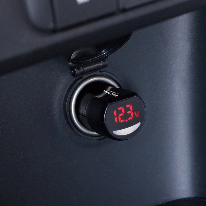 アクセサリー電源ソケットに挿し込むだけで簡単に車両の電圧を測定し、表示する
