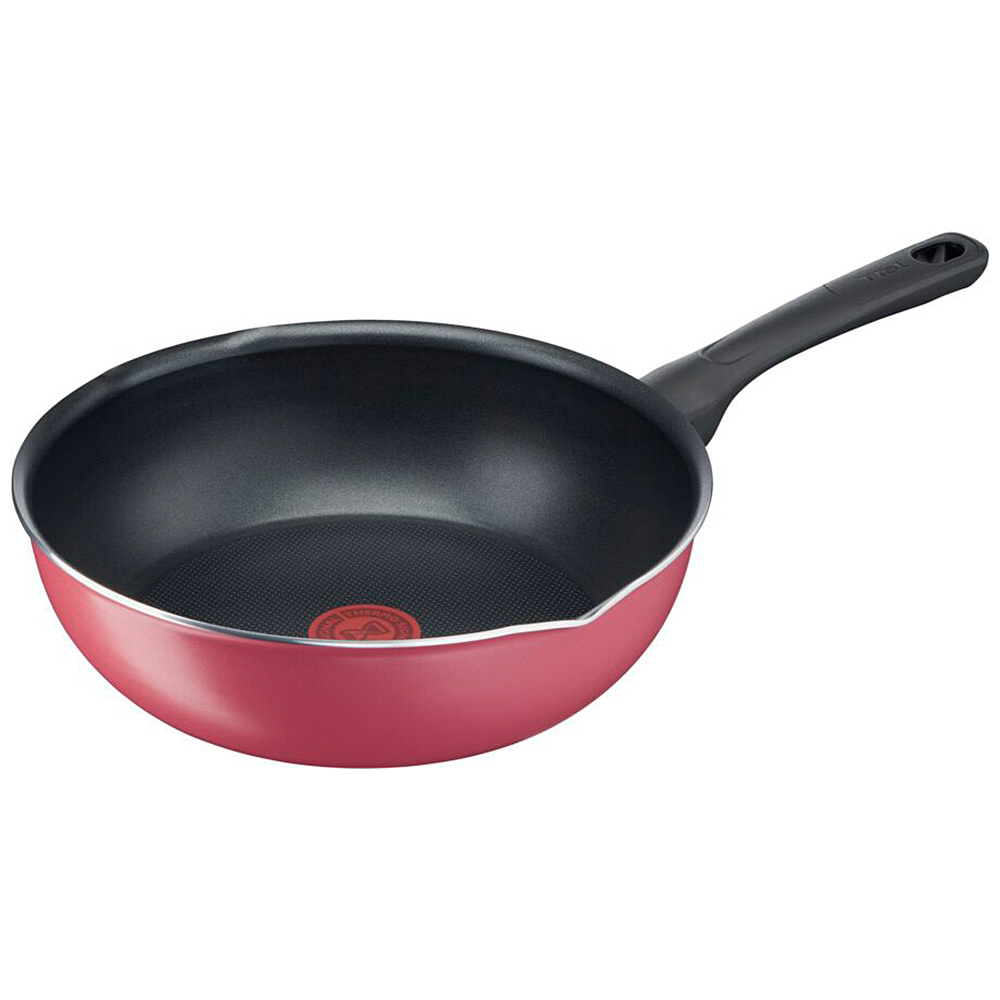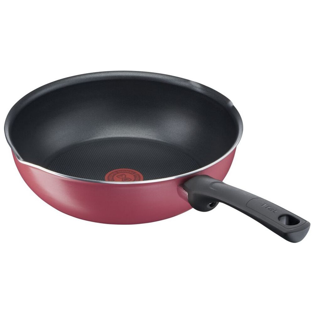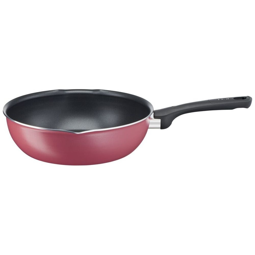 クランベリーレッドの深型フライパン。こびりつきにくく、耐久性が高い。IH・ガス火対応。