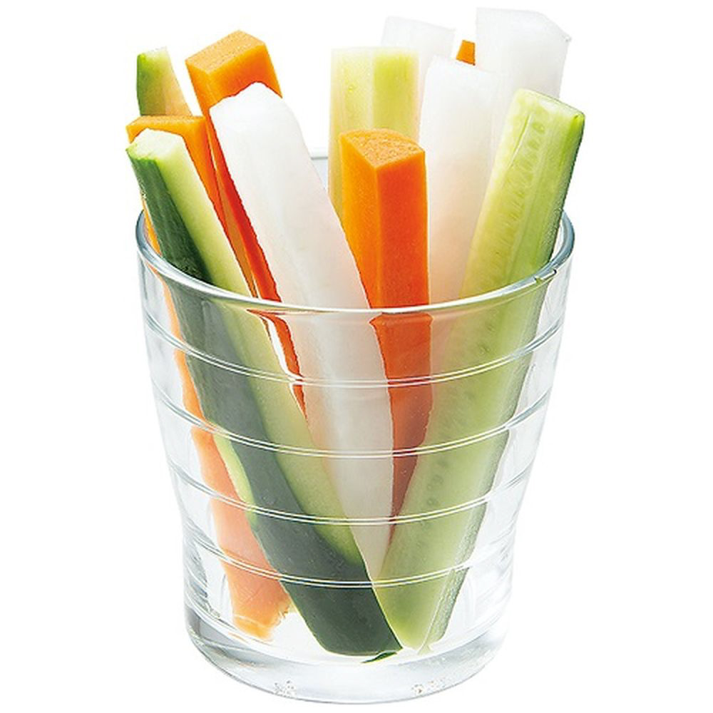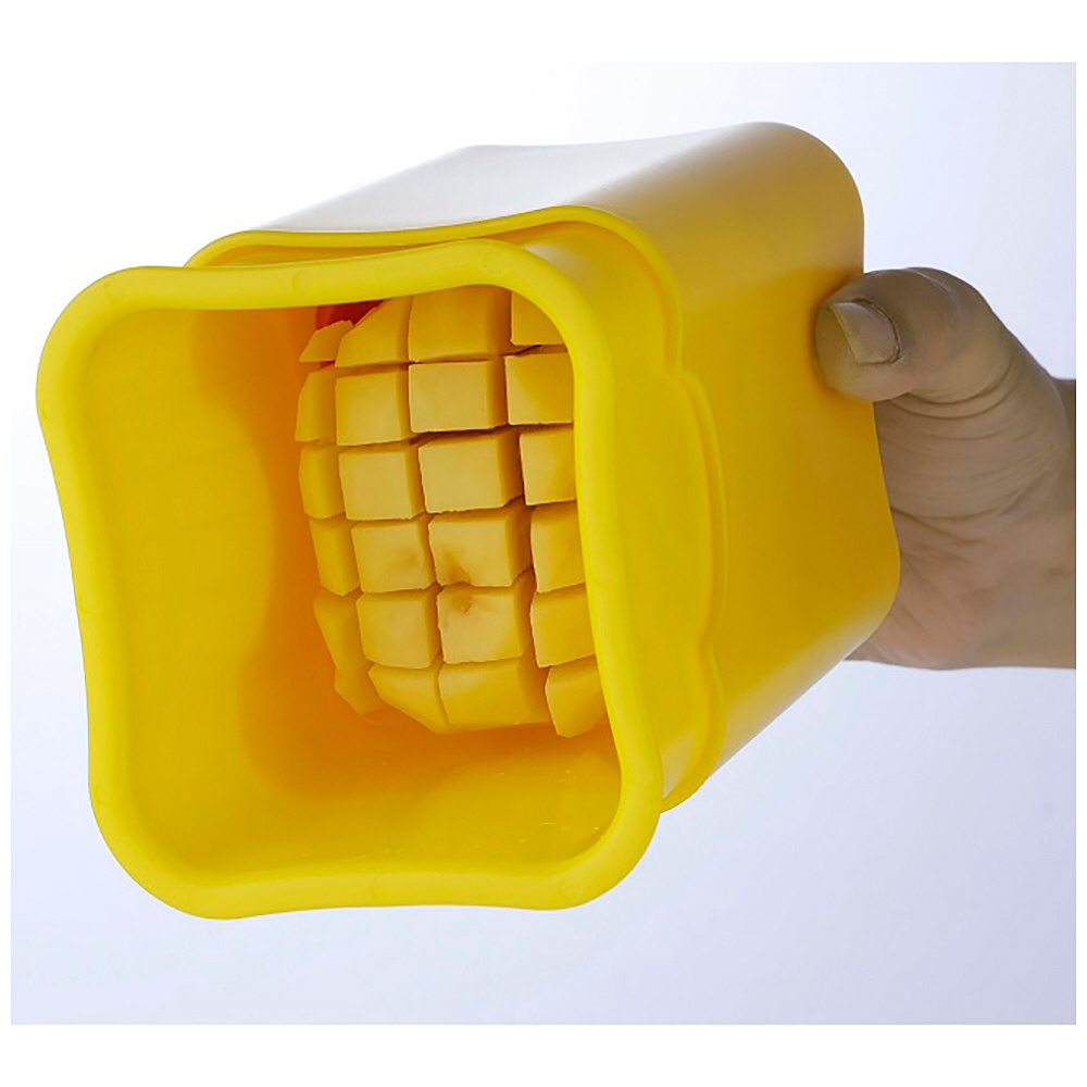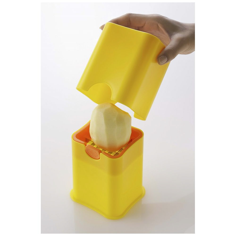 じゃがいもをのせて押すだけで、均一な太さのスティック状にカットできます。野菜スティックにも。 押板・カッター部(オレンジ色の部品)は食洗機OK