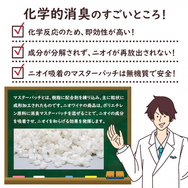 消臭成分を袋にねり込み、悪臭を化学的に消臭する為、いやなにおいを和らげることができるごみ袋です。