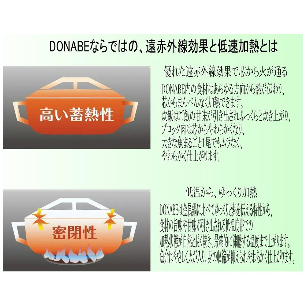 DONABE は、多種多様な料理をおいしく作るための現代的な万能土鍋として耐熱性の高い土から研究して開発されました。非常に優れた遠赤外線効果と土鍋としては高い密閉性により、炊飯・煮炊きもの・蒸しもの、オーブン料理をより美味しく、さらに無水調理にも活躍します。