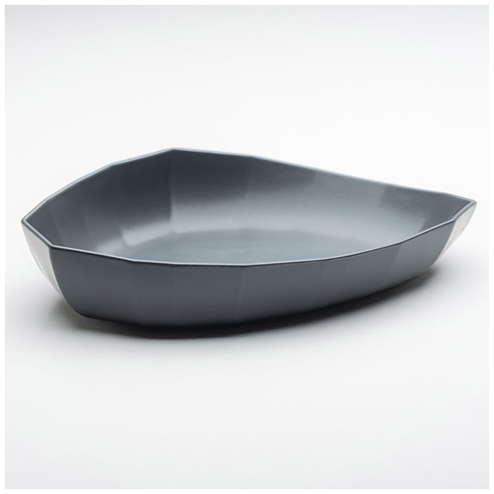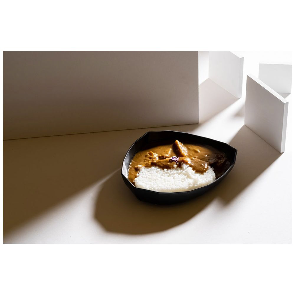 形は幾何学的でありながら、デザインプロダクトらしいシャープさ、陶磁器の温かみと柔らかさを兼ね備えたカレー皿。