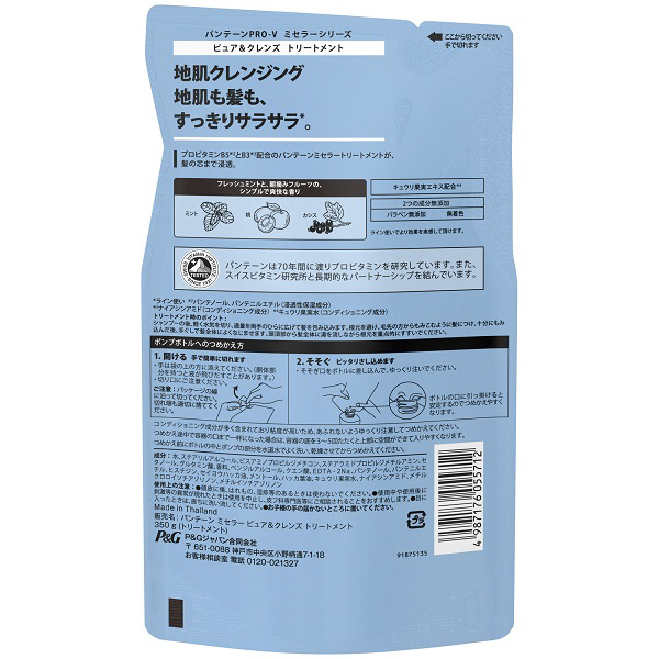 パンテーン ミセラーミクロな汚れまで洗い流す、地肌クレンジング成分「ミセラー粒子」配合地肌クレンジング地肌も髪も、すっきりサラサラ。プロビタミンB5とB3配合のパンテーンミセラートリートメントが、髪の芯まで浸透。フレッシュミントと、朝摘みフルーツの、シンプルで爽快な香りミント桃カシスキュウリ果実エキス配合2つの成分無添加パラベン無添加 無着色ライン使いでより効果を実感して頂けます。