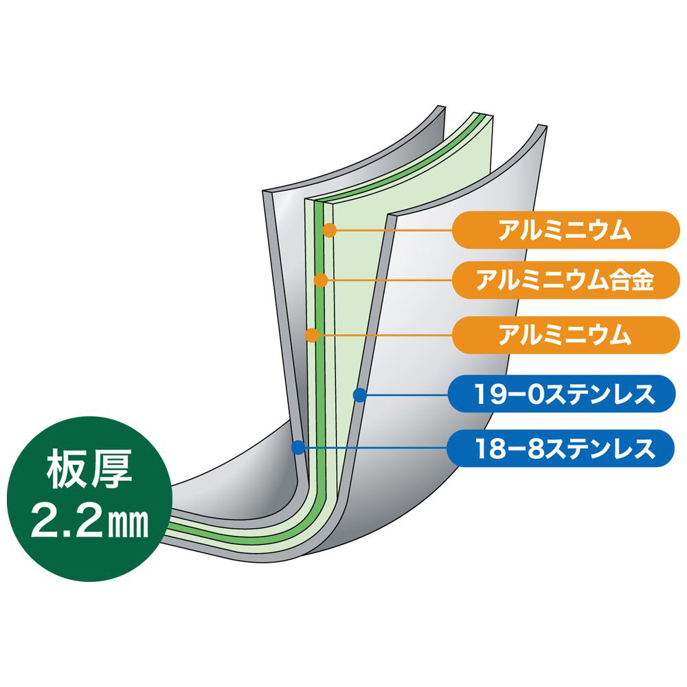 全面5層構 造熱伝導に優れ、強度を高めたアルミニウム3層を保温性に優れたステンレスで挟み込みました。