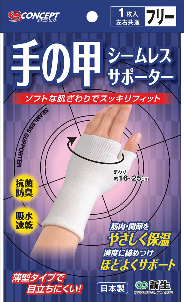 ●ソフトな肌ざわりでスッキリフィット、手の甲用シームレスサポーターです。