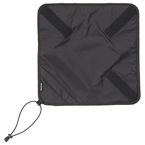 面ファスナーのない角から包んでゆき、最終的にバンジーコードをレンズ部分に掛けて固定します。ストラップを出した状態で包むことが可能です。小型のミラーレス一眼カメラに適したサイズです。