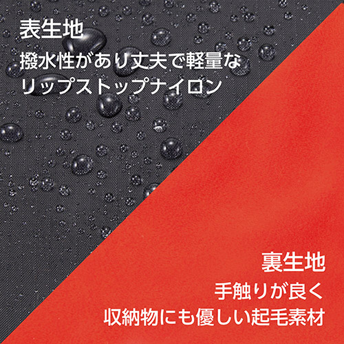 表生地には軽量ながら丈夫なリップストップナイロンを採用。撥水効果があり、雨などの水滴から収納物を保護します。裏生地には手触りが良く収納物にも優しい起毛素材を採用しています。