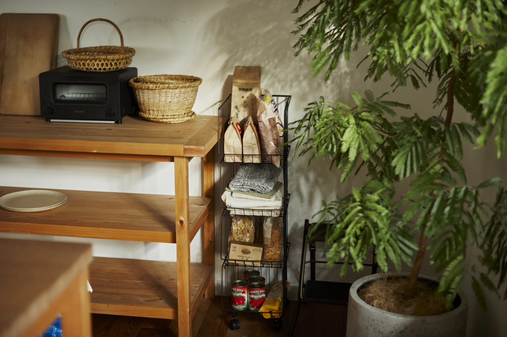 一般的なキッチン台の高さと相性のいい4段タイプと、テーブル横のサイドシェルフやランドリーラックにおすすめの3段タイプ。シーンに合わせてお使いいただけるように、サイズは2種類ご用意しました。
