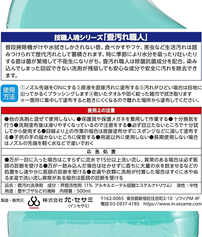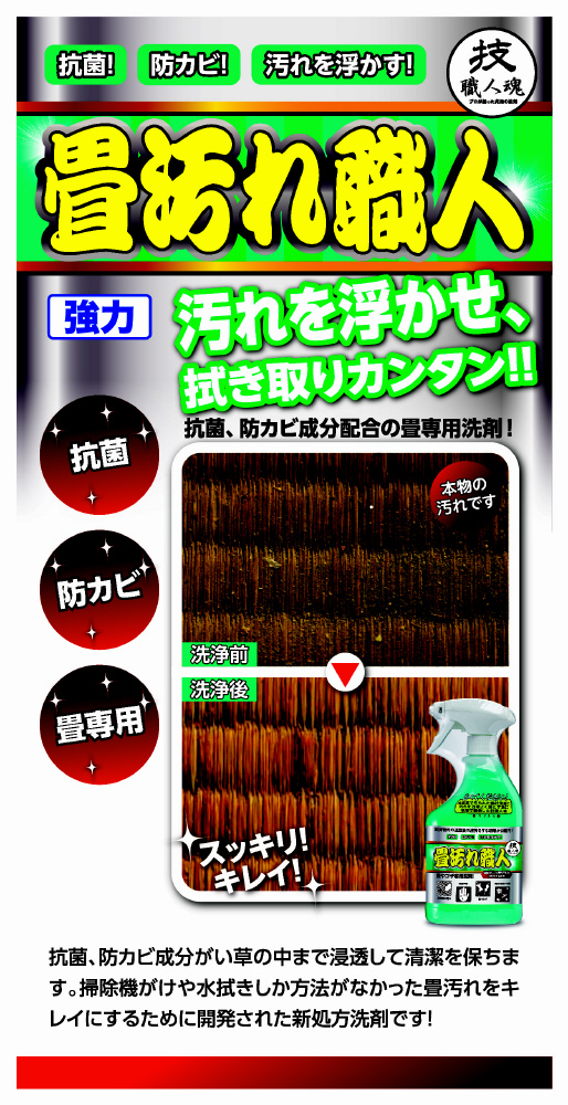 しかし本商品は抗菌、防カビ成分配合を配合しているので、汚れを落としつつメンテナンスのできる優れた畳専用洗剤です。